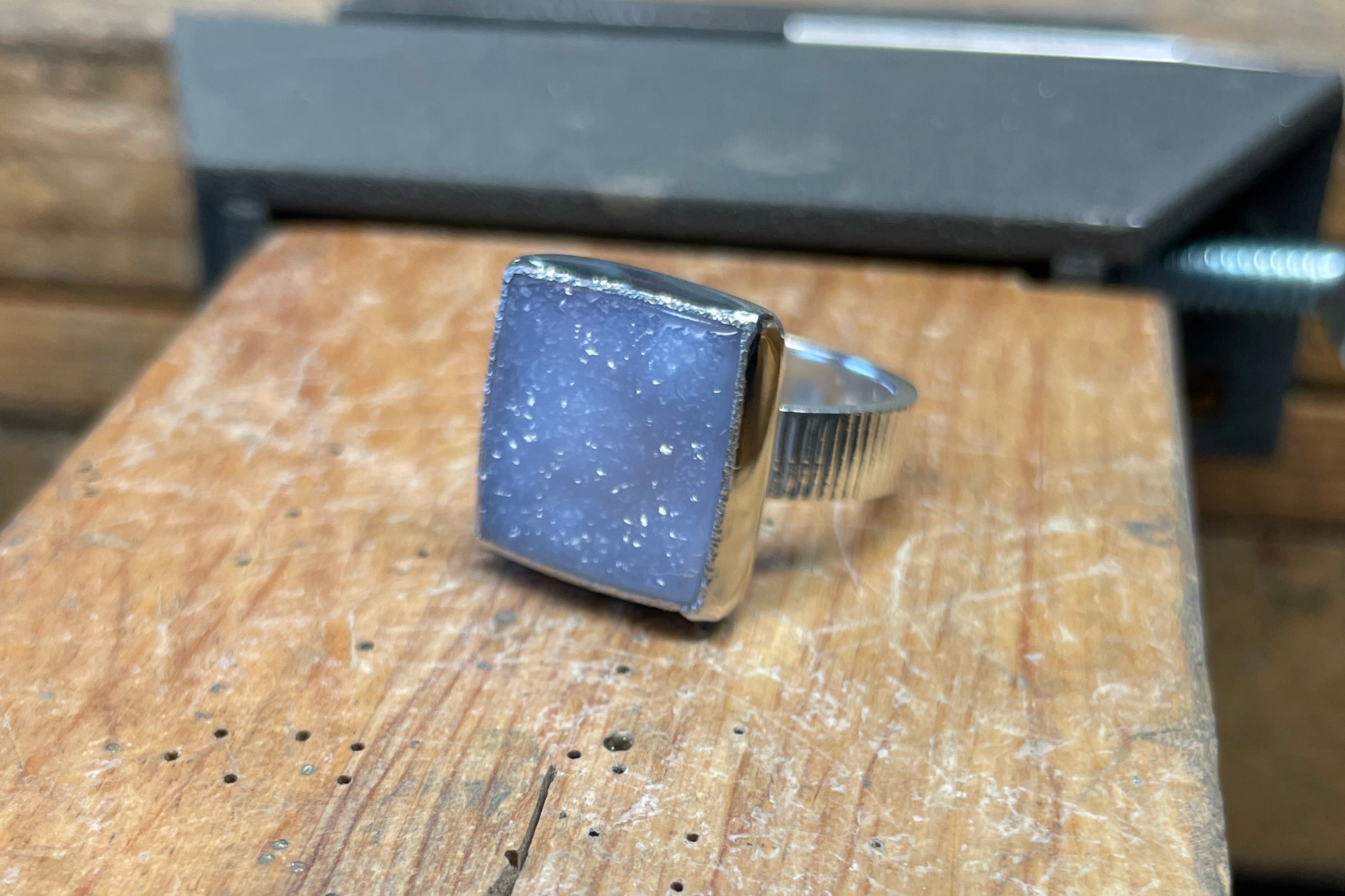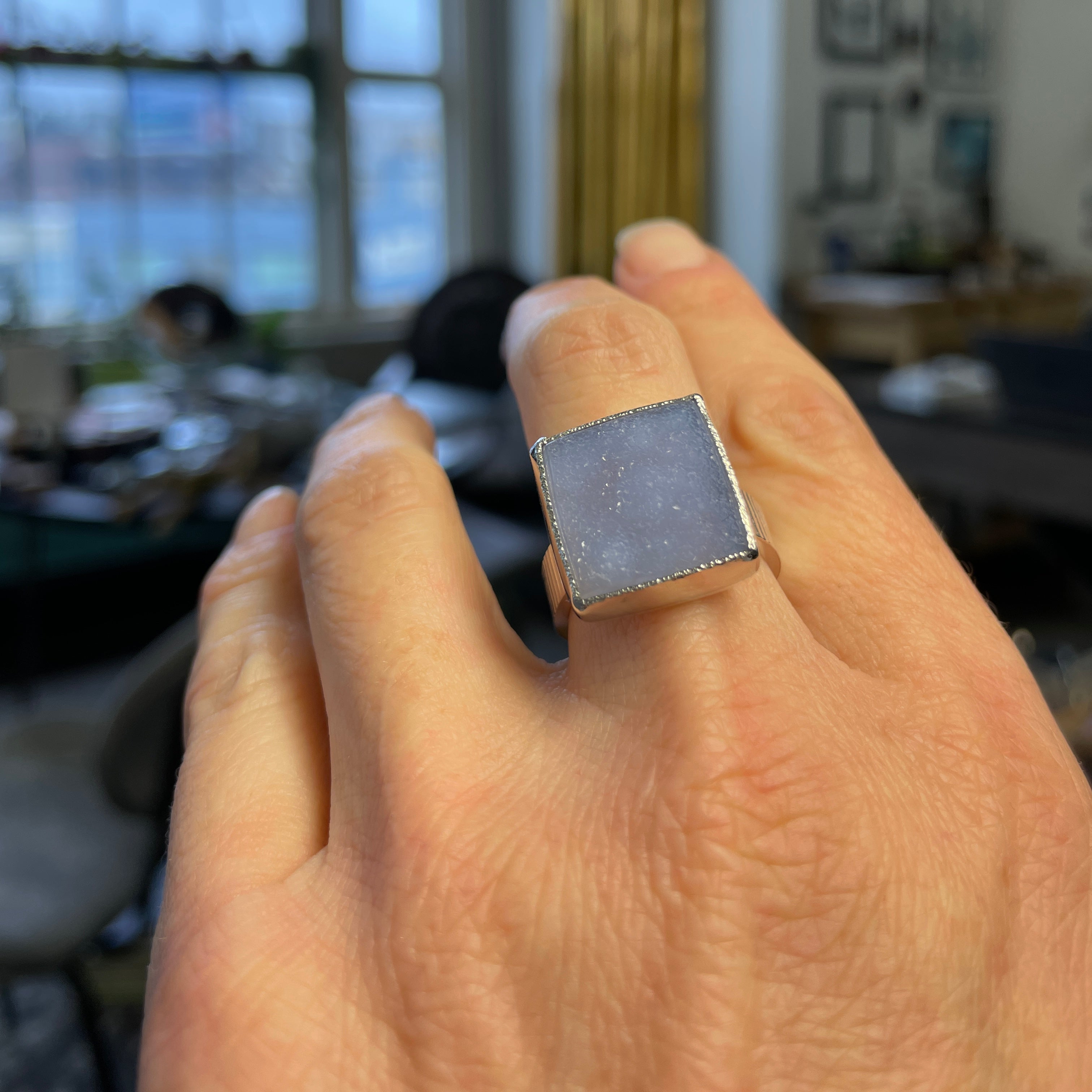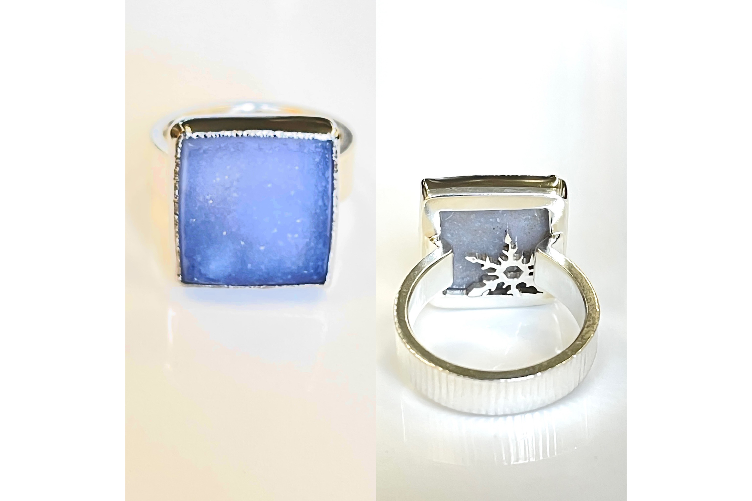 This gorgeous natural Chalcedony Drusy glistens like snow in the sunshine. Handset in an recycled palladium (sister metal of platinum) featuring a snowflake design and centered on a corduroy band in recycled sterling silver.