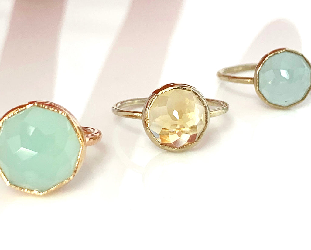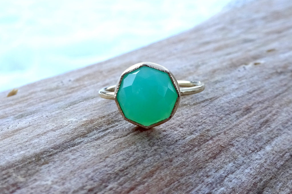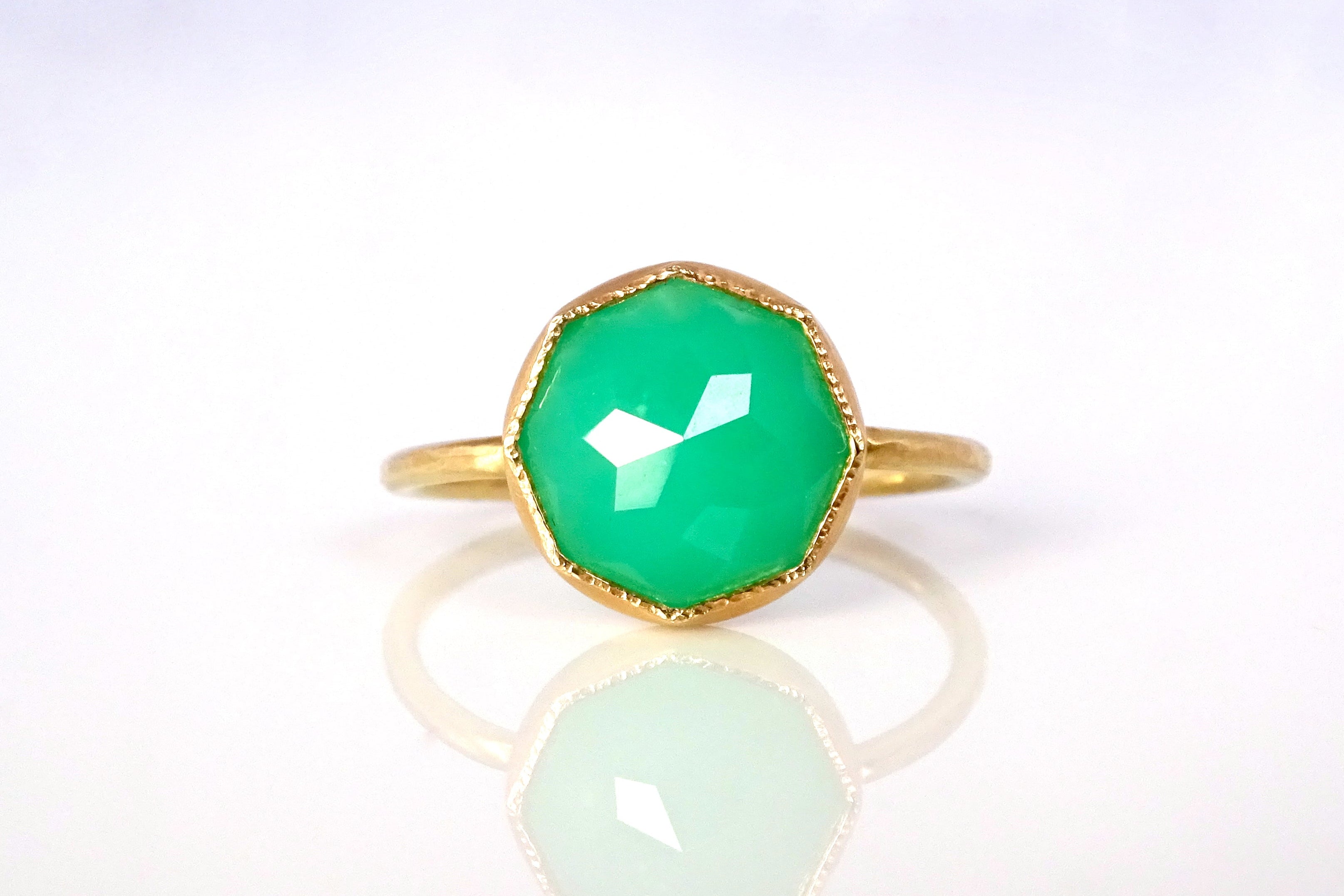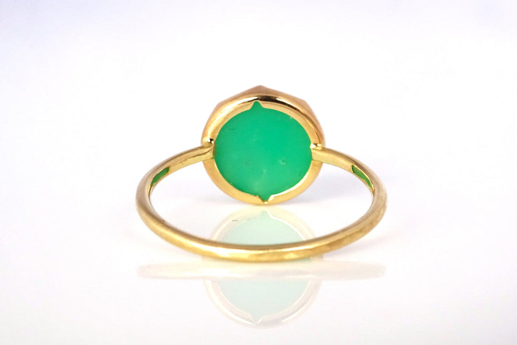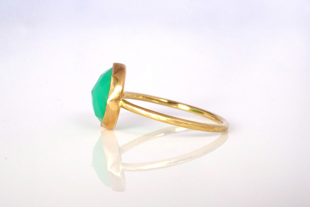 A beautiful 12mm round faceted Chrysoprase Stacker Ring is handset in recycled gold and centered on a round delicately hammered recycled gold band.