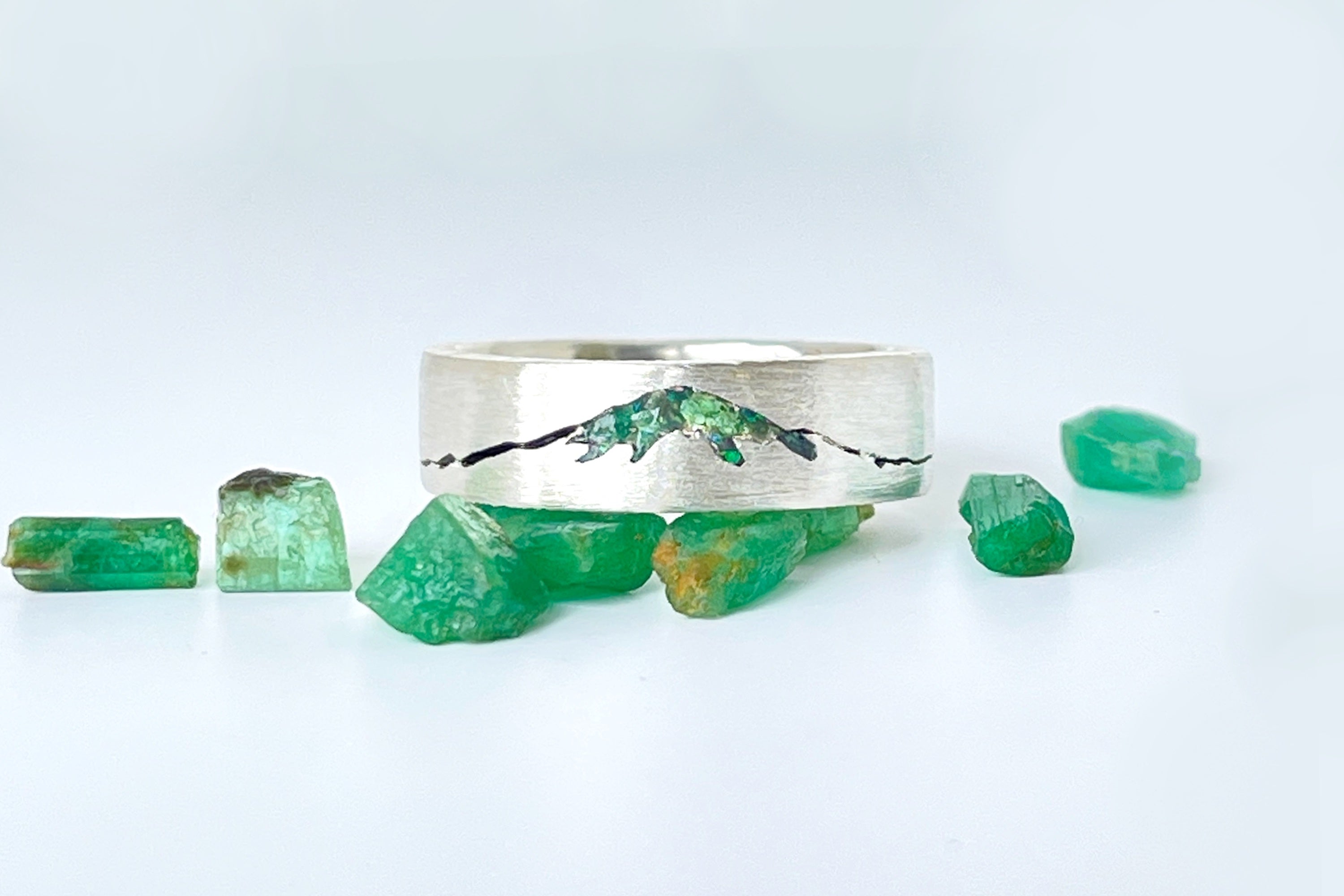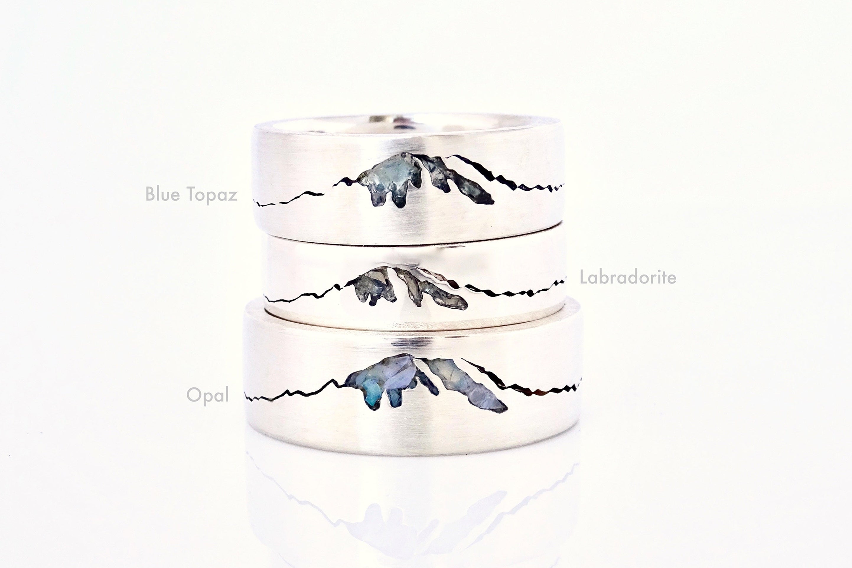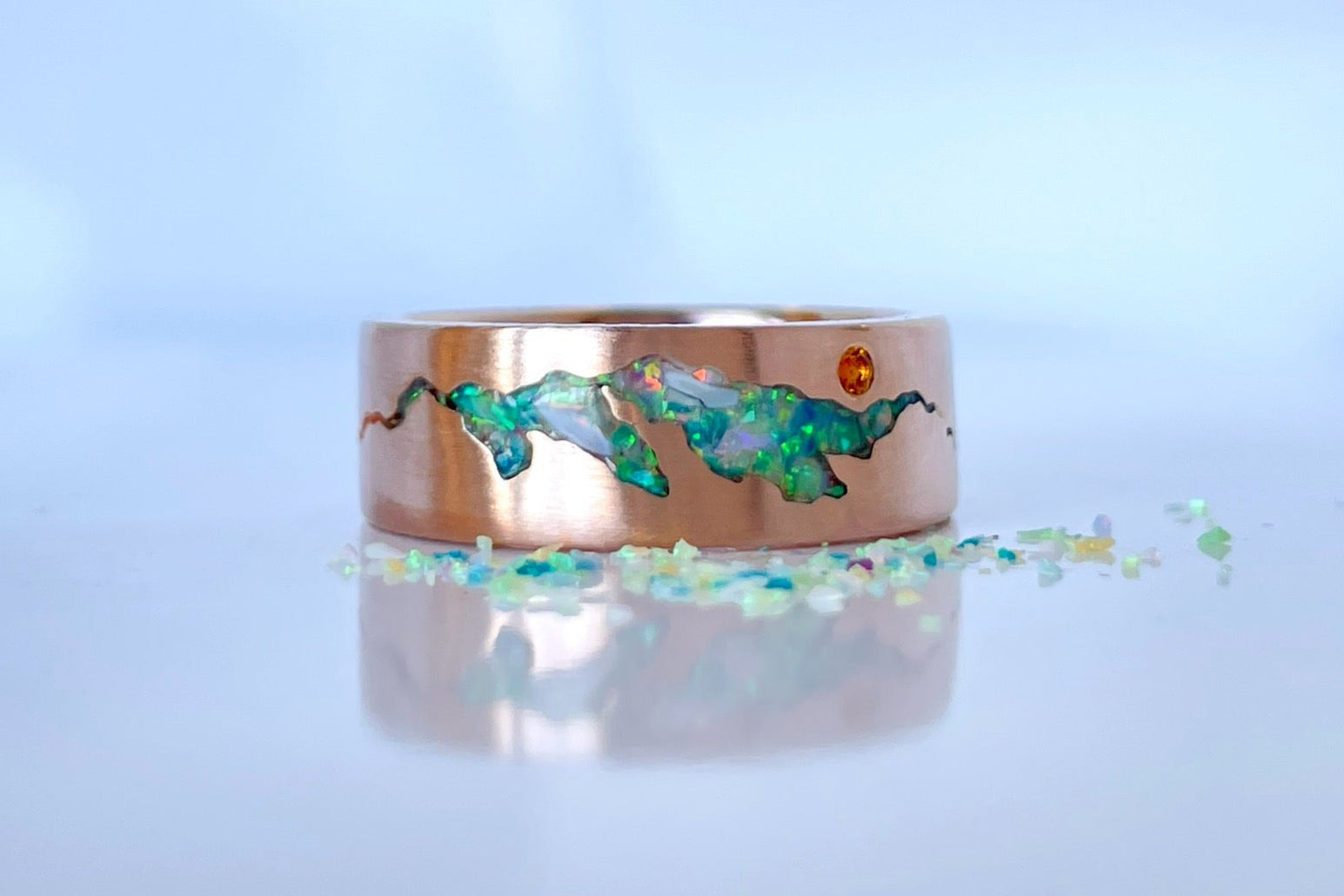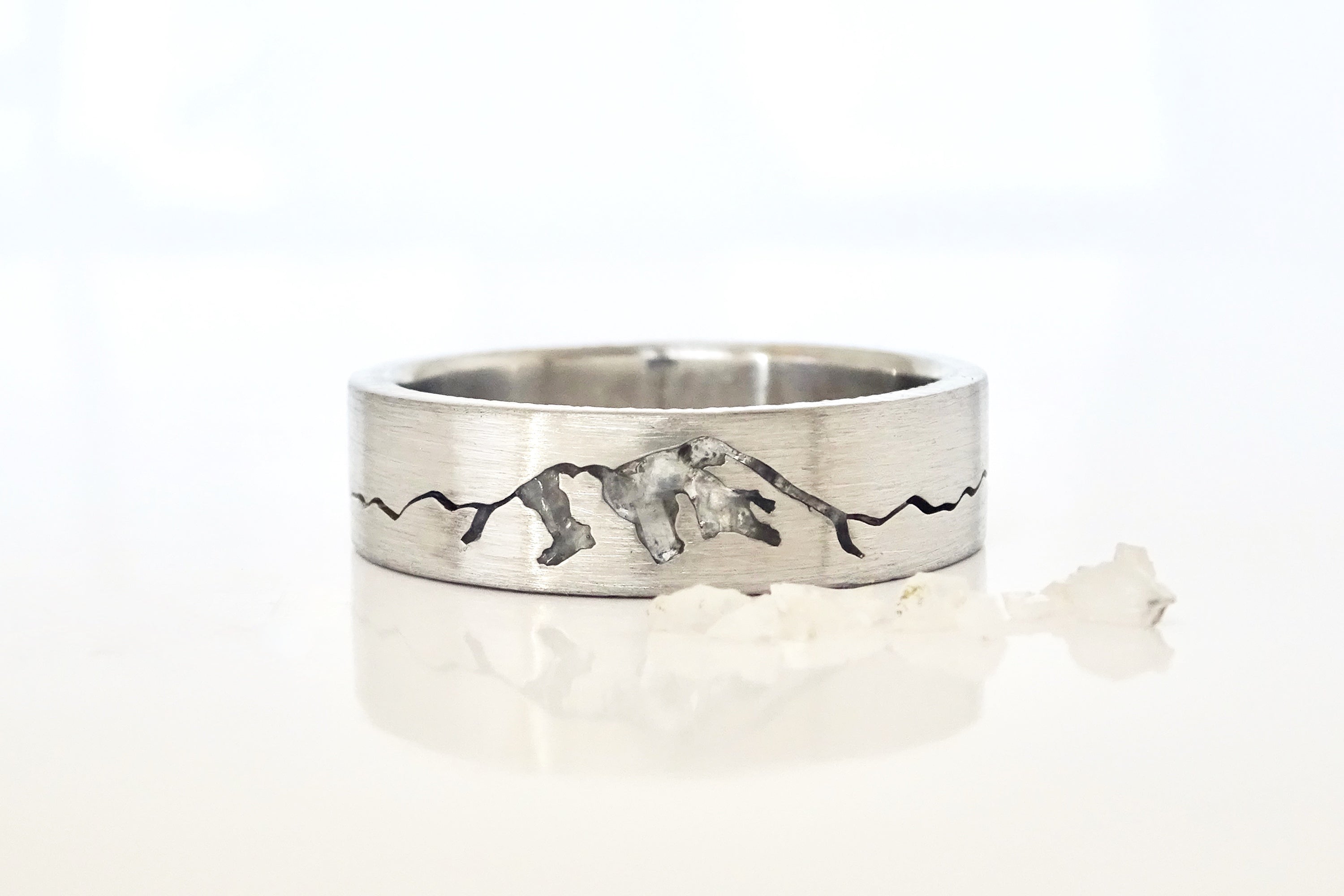 After you’ve placed your order, send us a message with an image of the mountain range(s) you would like featured on your custom ring. Within a week we will reach out to you to begin finalizing the designs for your custom summit mountain ring with gemstone inlay.