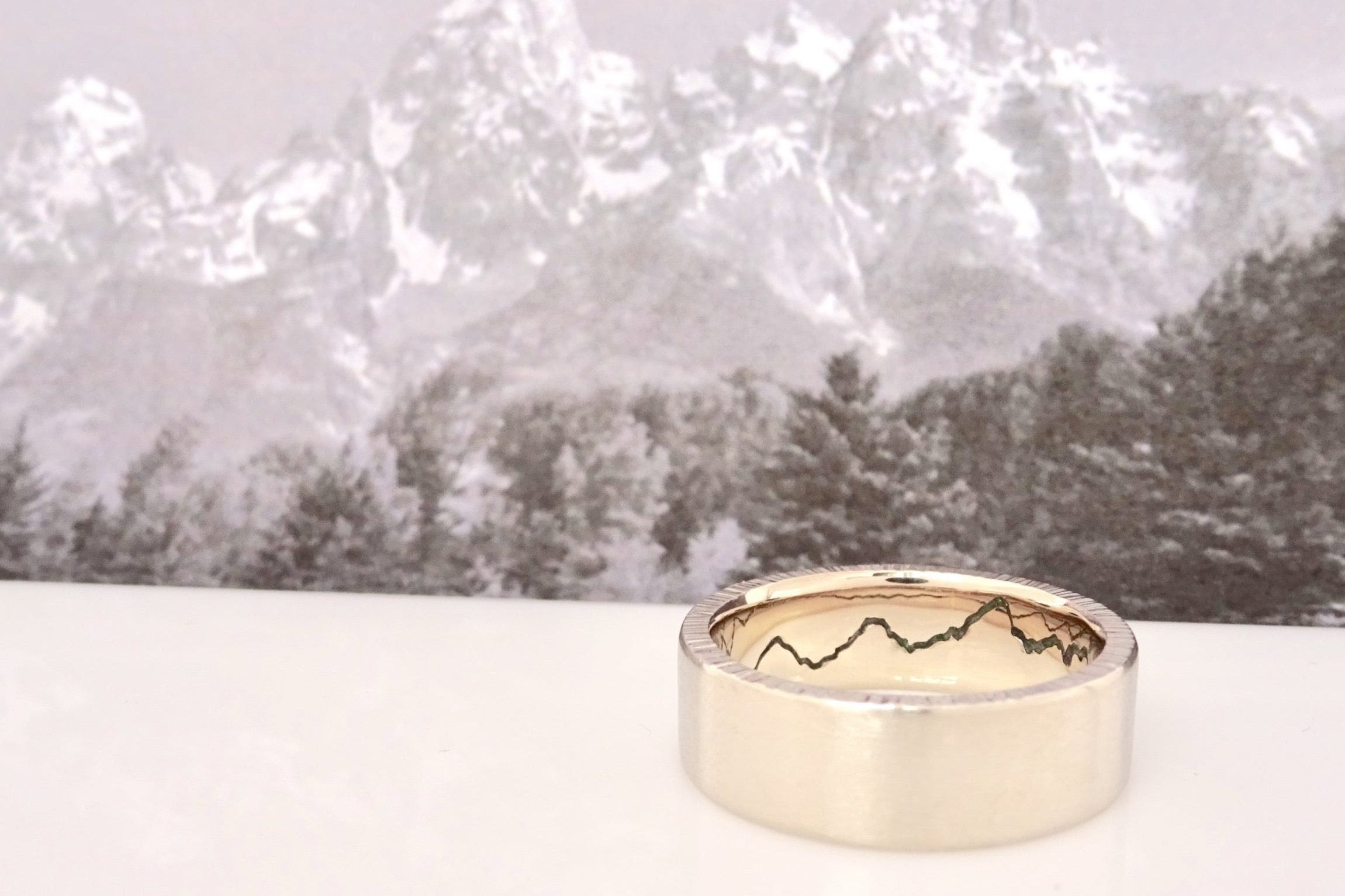 After you’ve placed your order, please send us a message with a image of the mountain range(s) you would like featured on your custom ring. Within a few weeks we will reach out to you to begin finalizing the designs for your hidden inlay mountain ring.