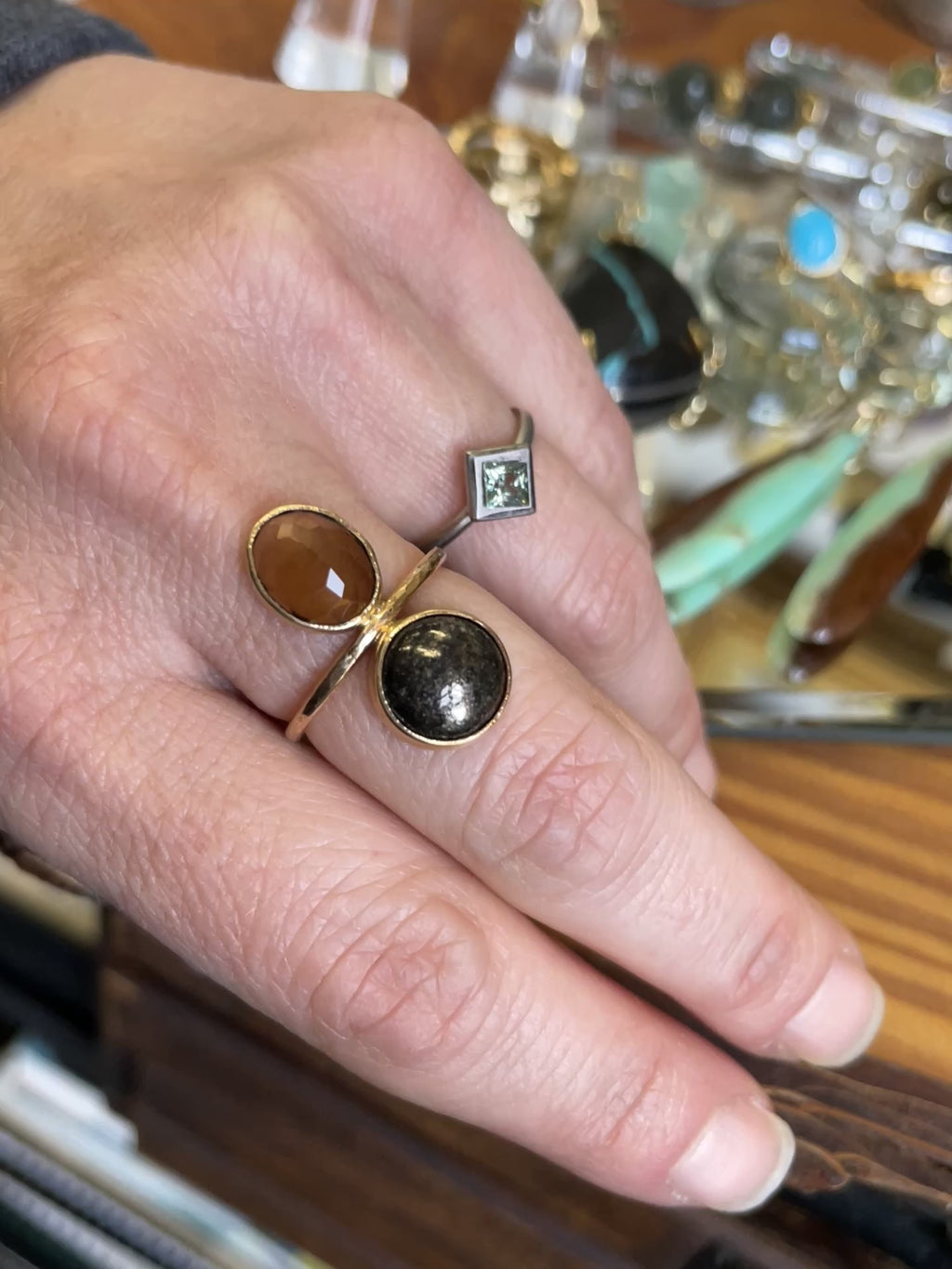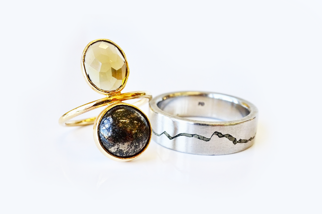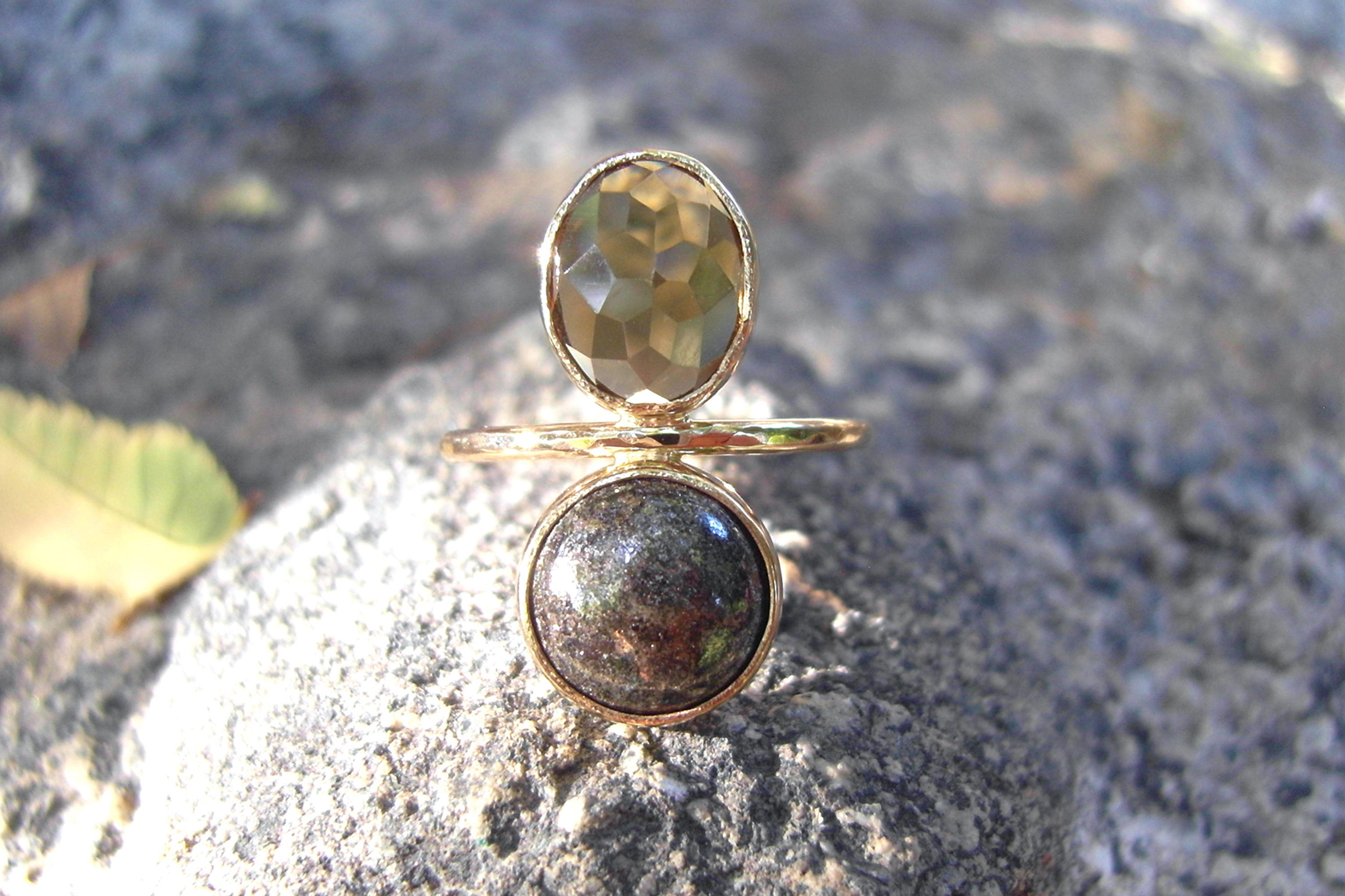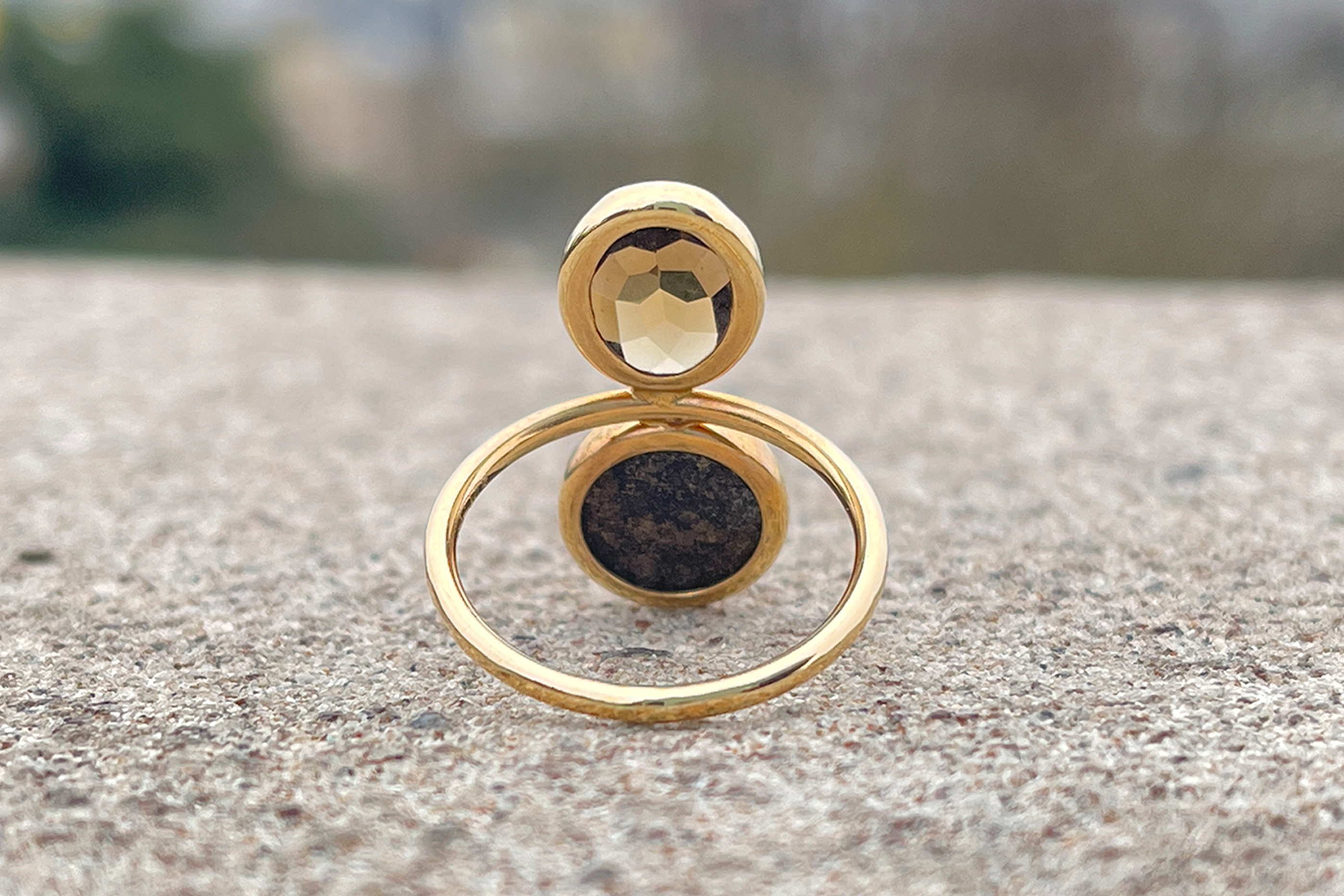 This gorgeous Cleo ring combines a stunning mix of rich yellow gold, Pyrite and faceted honey Quartz. Handcrafted from recycled 14k yellow gold, lovely details and textures have been carefully selected to draw attention to all aspects of this one-of-a-kind artisan ring.