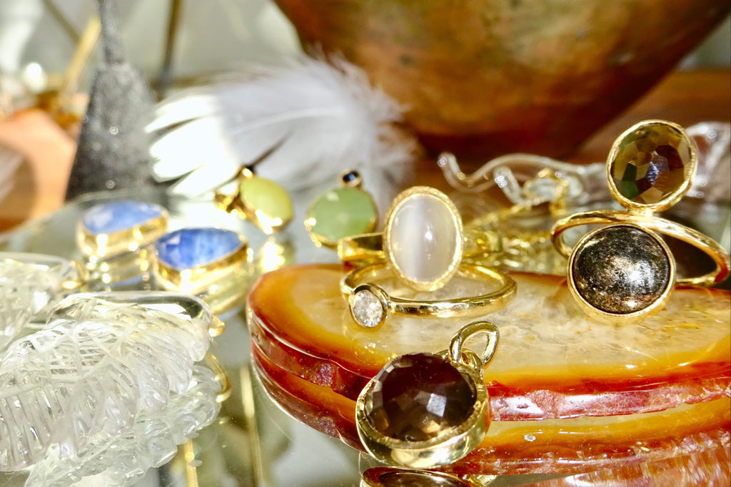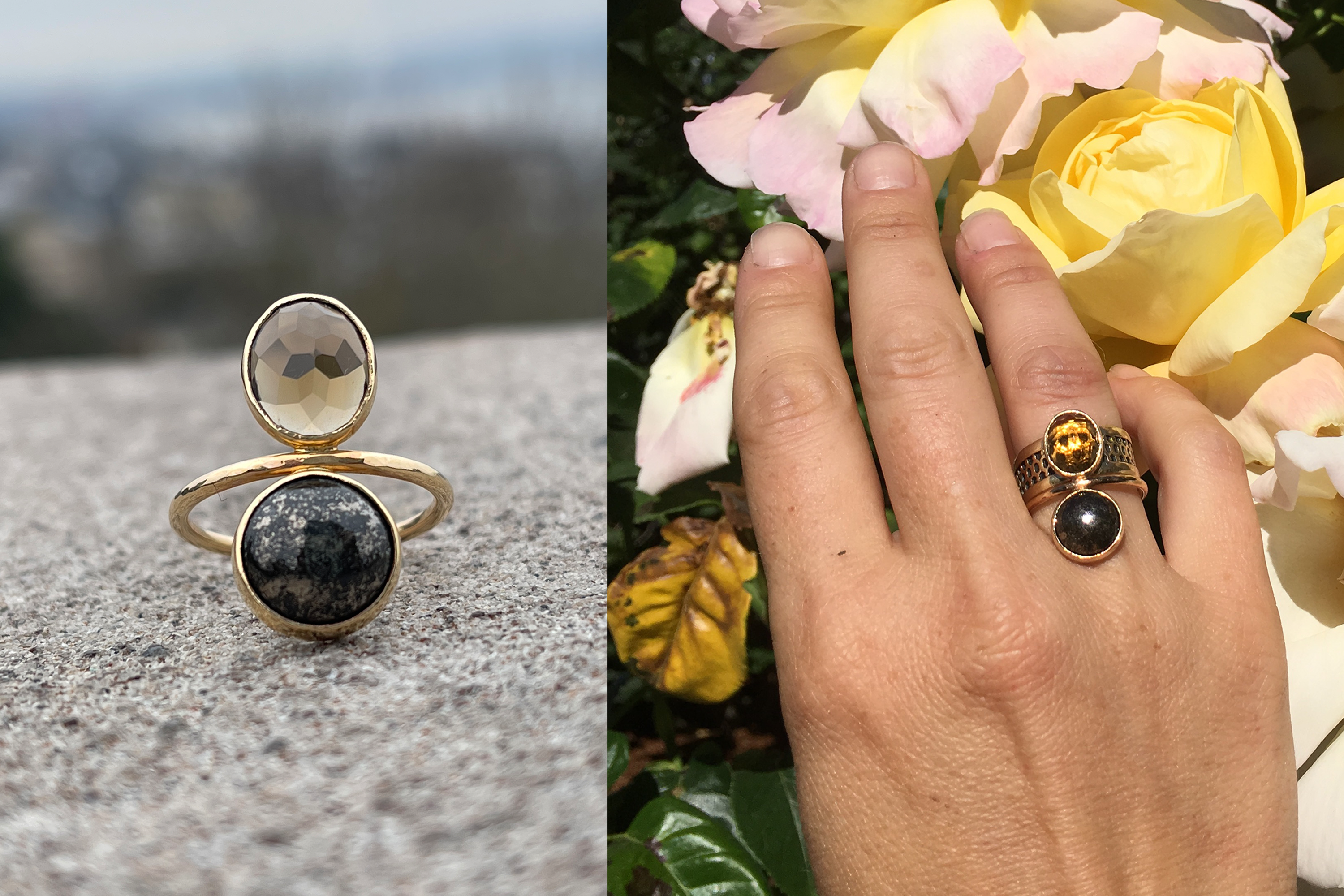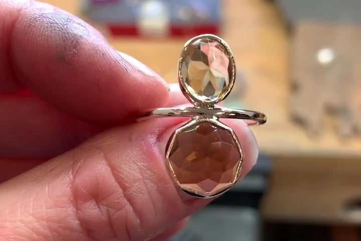 Each gemstone was hand-cut with my signature Dahlia faceting. The oval measures 8x10mm and the round measures 10mm. Handmade bezels are open on the bottom, allowing contact between the gemstone and you.