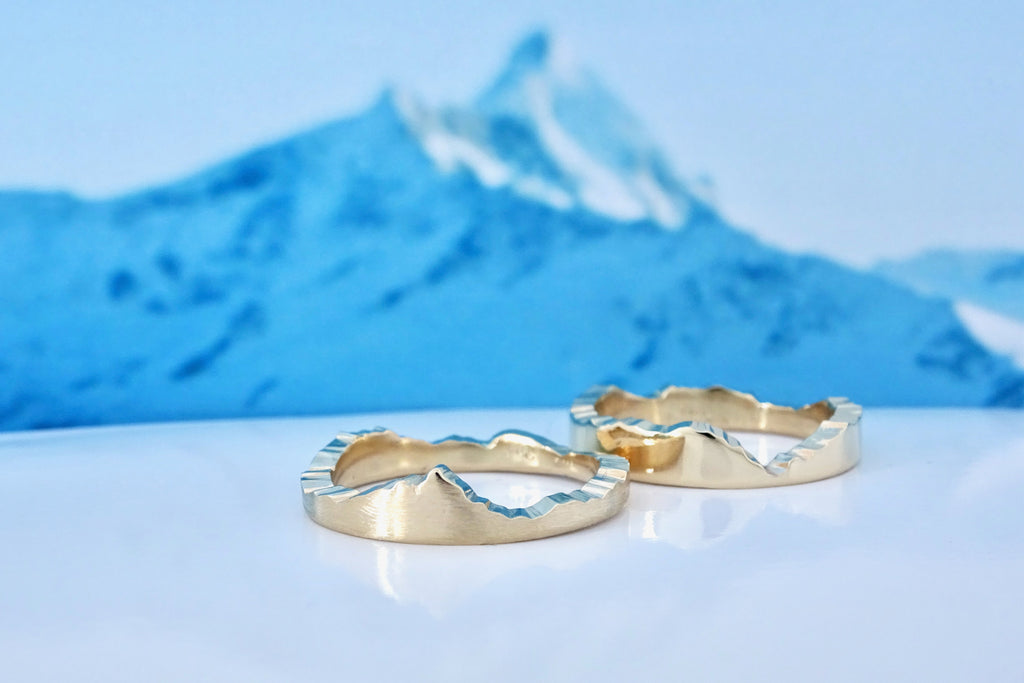 Celebrate your love for nature, adventure, and each other with this 14k solid yellow gold interlocking mountain ring. Designed to represent unity and the peaks and valleys of life's journey, these minimalist bands nest together perfectly to form a stunning mountain silhouette.