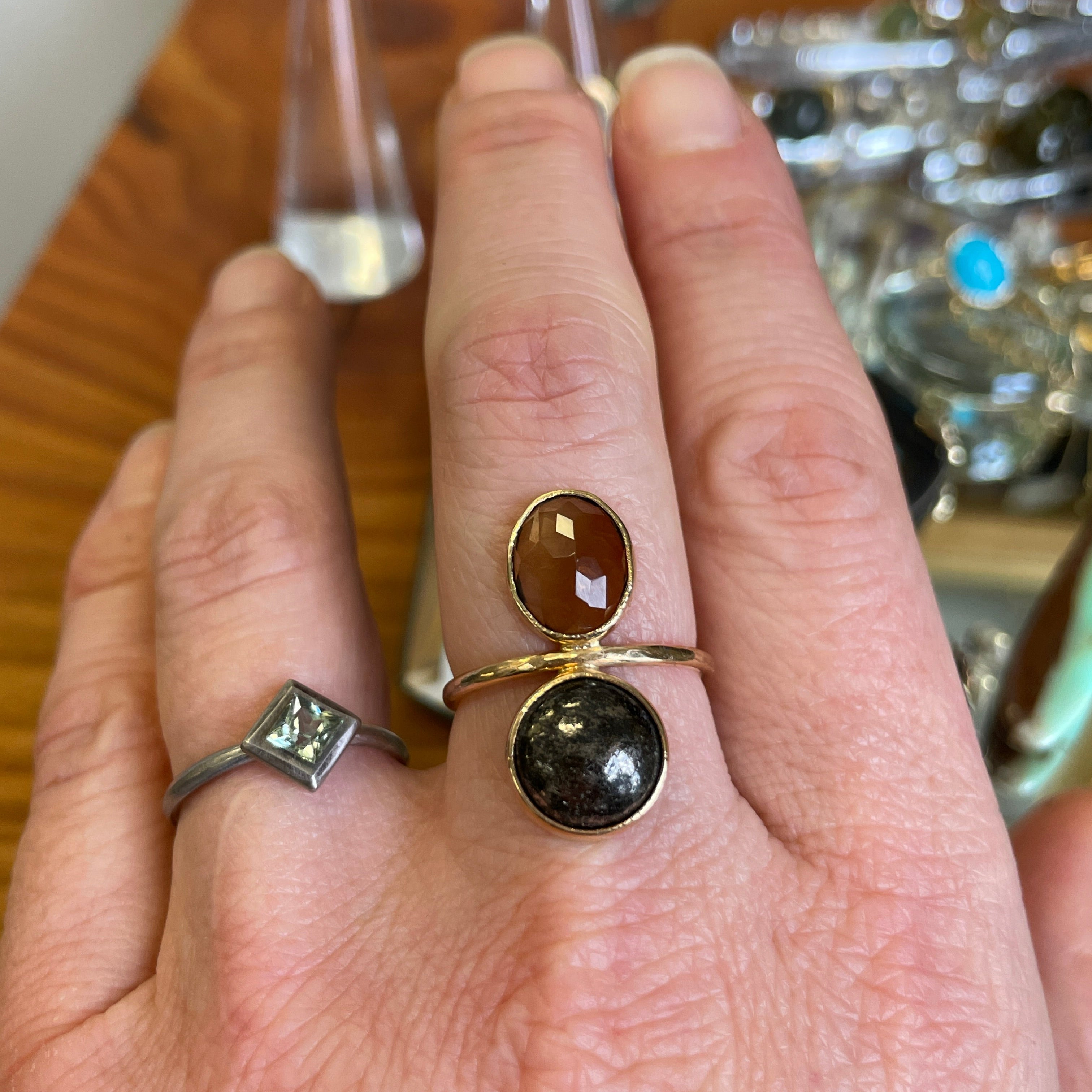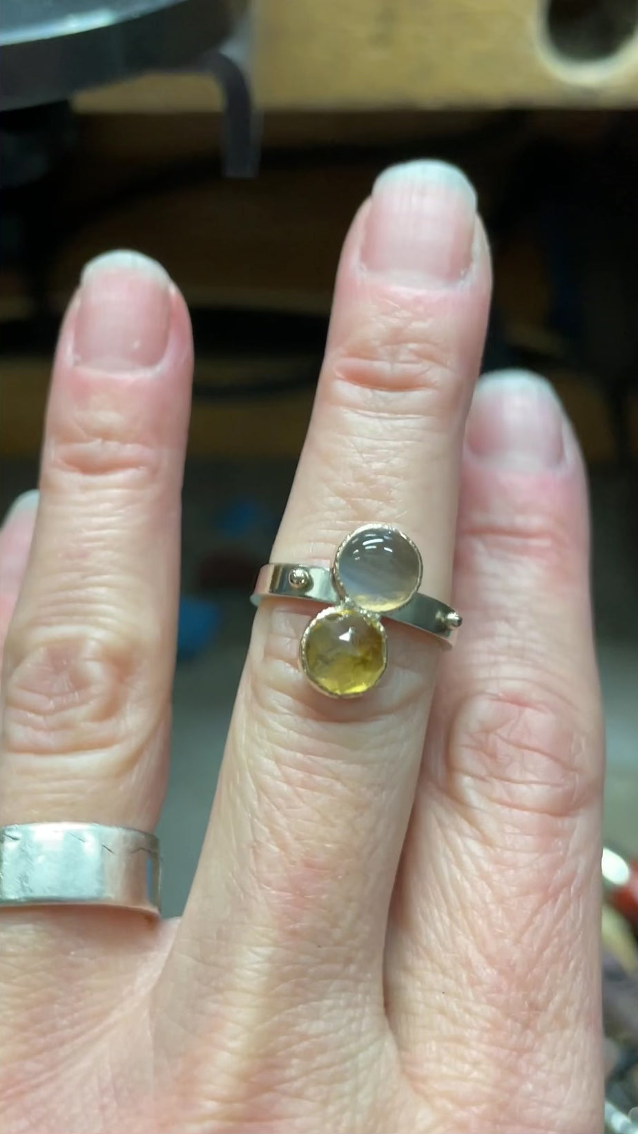 Introducing one my latest designs, the Knockers Fidget Ring with faceted Citrine & Grey Moonstone. A one of a kind kinetic ring, perfect for any fidgeter. Gemstones are bezel set in 14k yellow gold and swivels on 14k white gold band with two gold balls that act as brakes for the gemstone knocker. The shank is open on the bottom allowing for any ring size.