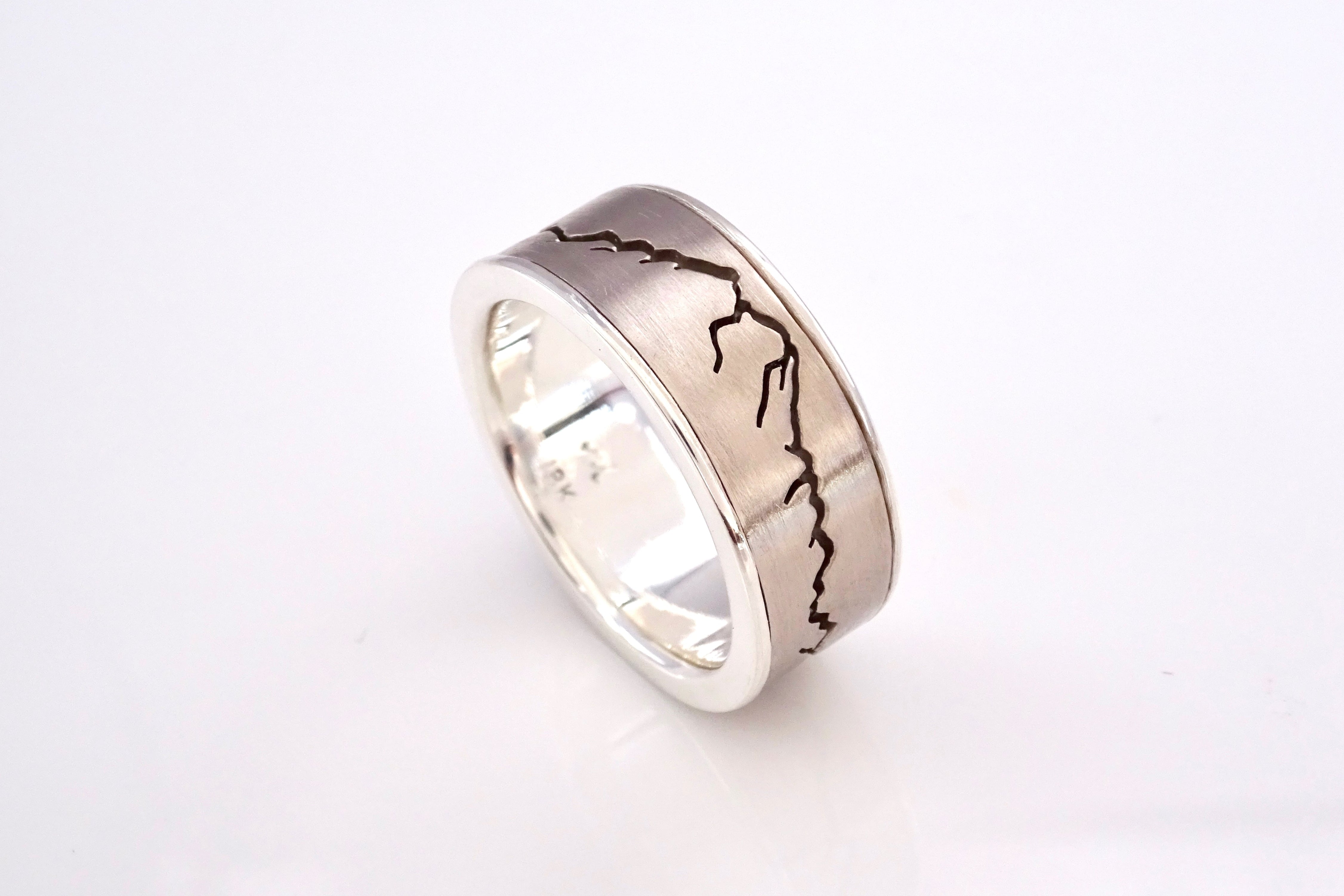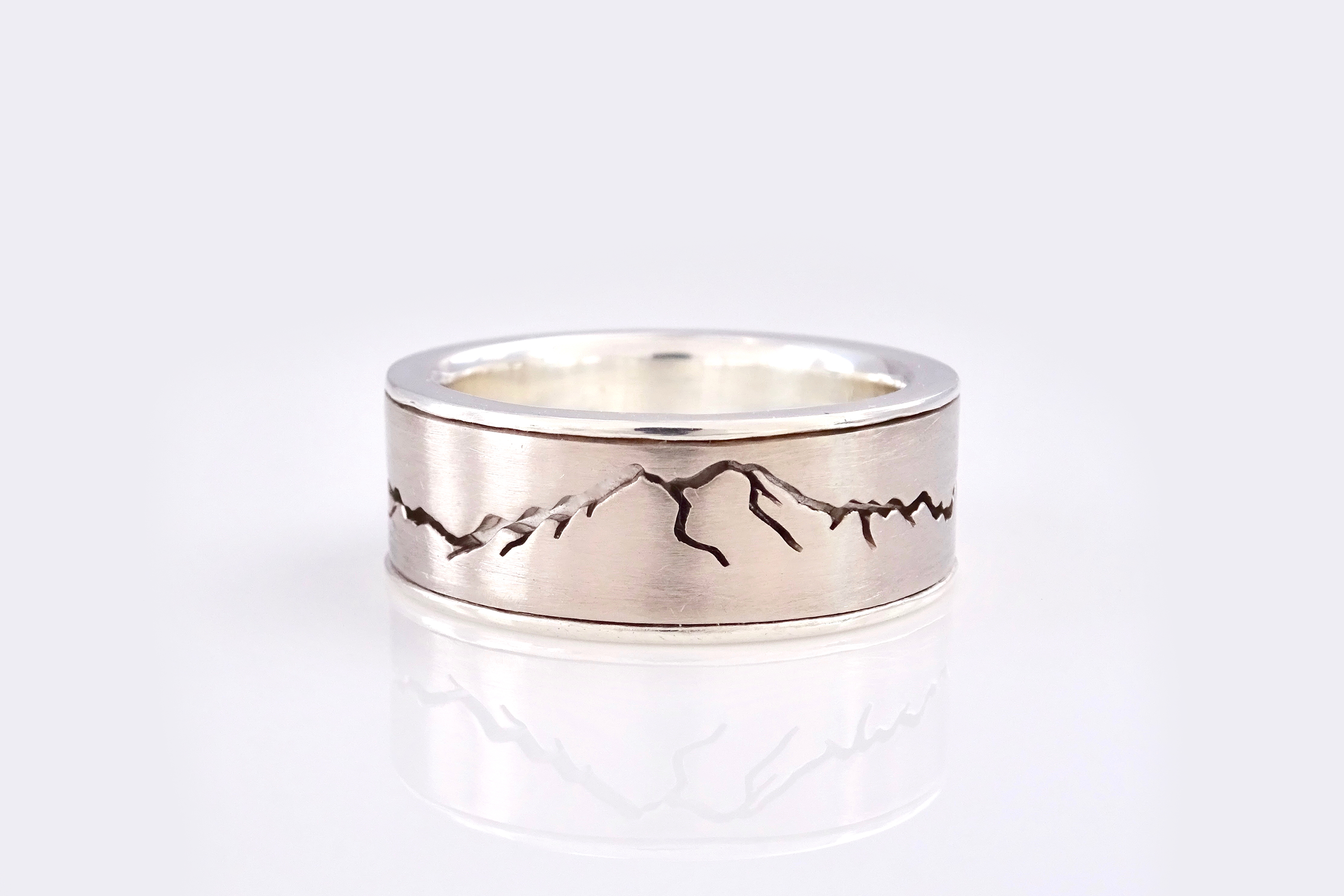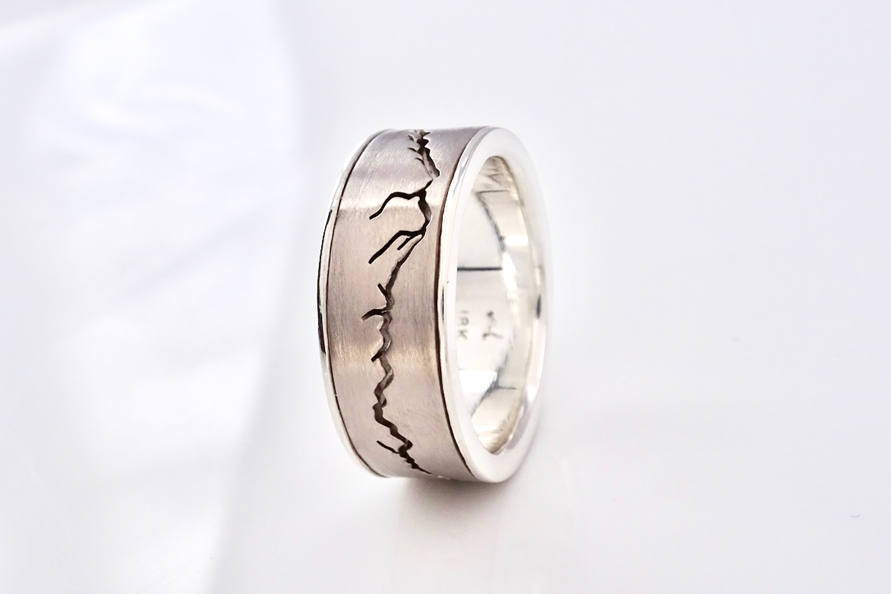 The Mixed Metals Mountain Wedding Band is handcrafted in recycled 18k palladium white gold with a sterling silver liner. Inspired by the majestic Olympic mountains in the Pacific Northwest this one of a kind ring was created for hikers, climbers, and outdoor lovers.