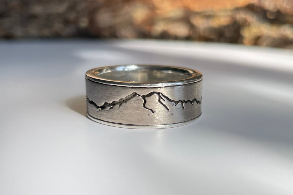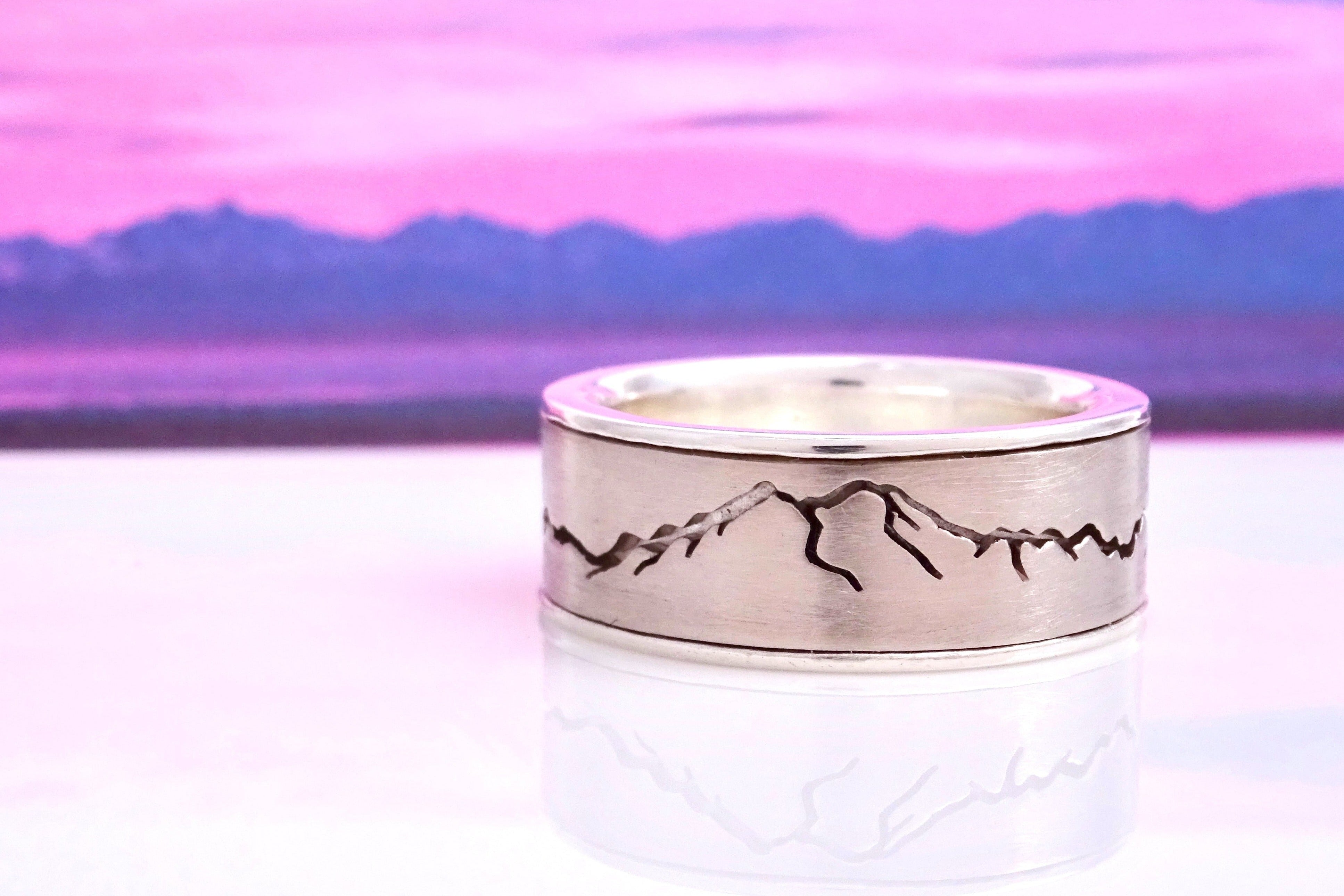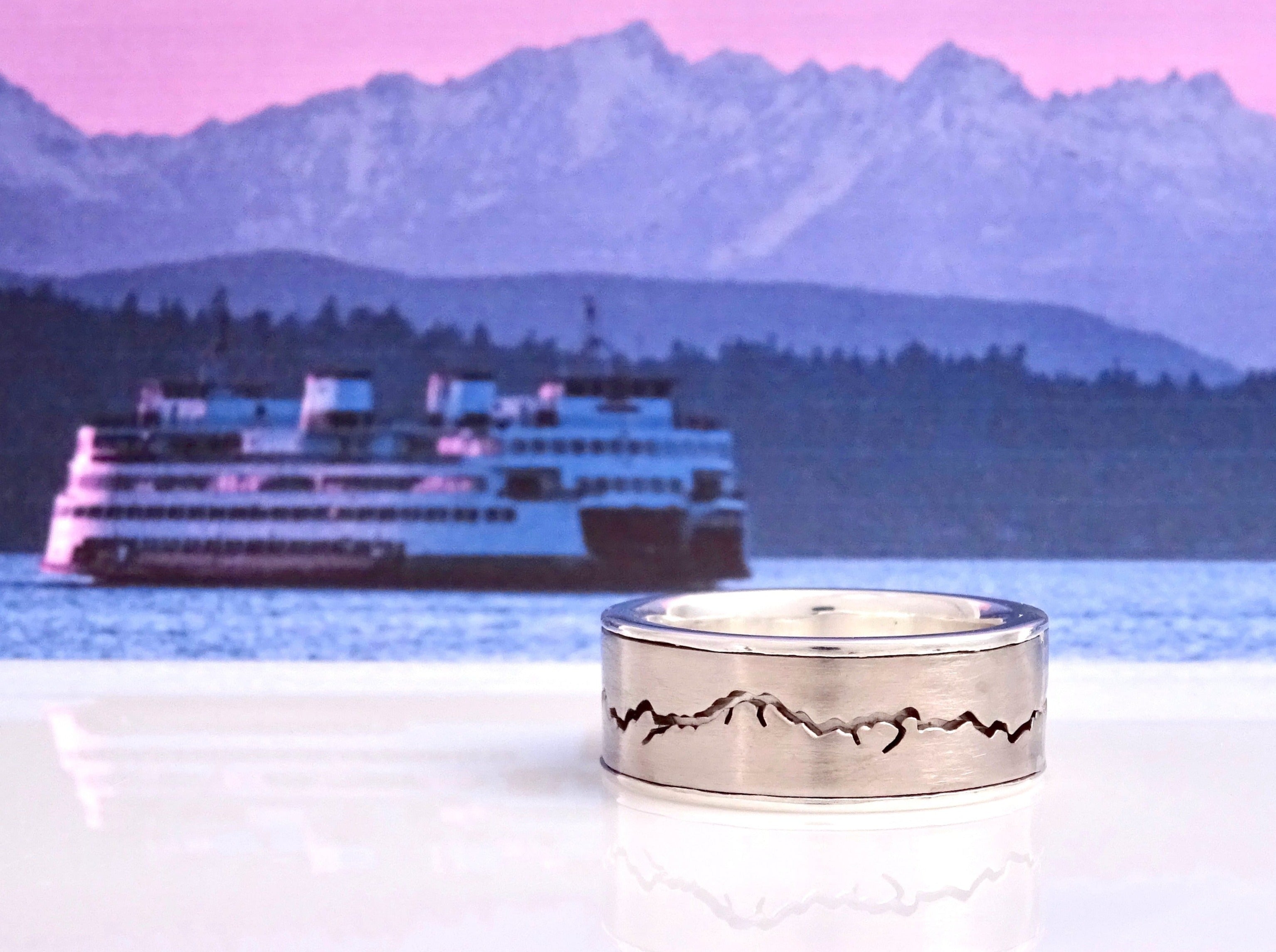 The Mixed Metals Mountain Wedding Band is handcrafted in recycled 18k palladium white gold with a sterling silver liner. Inspired by the majestic Olympic mountains in the Pacific Northwest this one of a kind ring was created for hikers, climbers, and outdoor lovers.