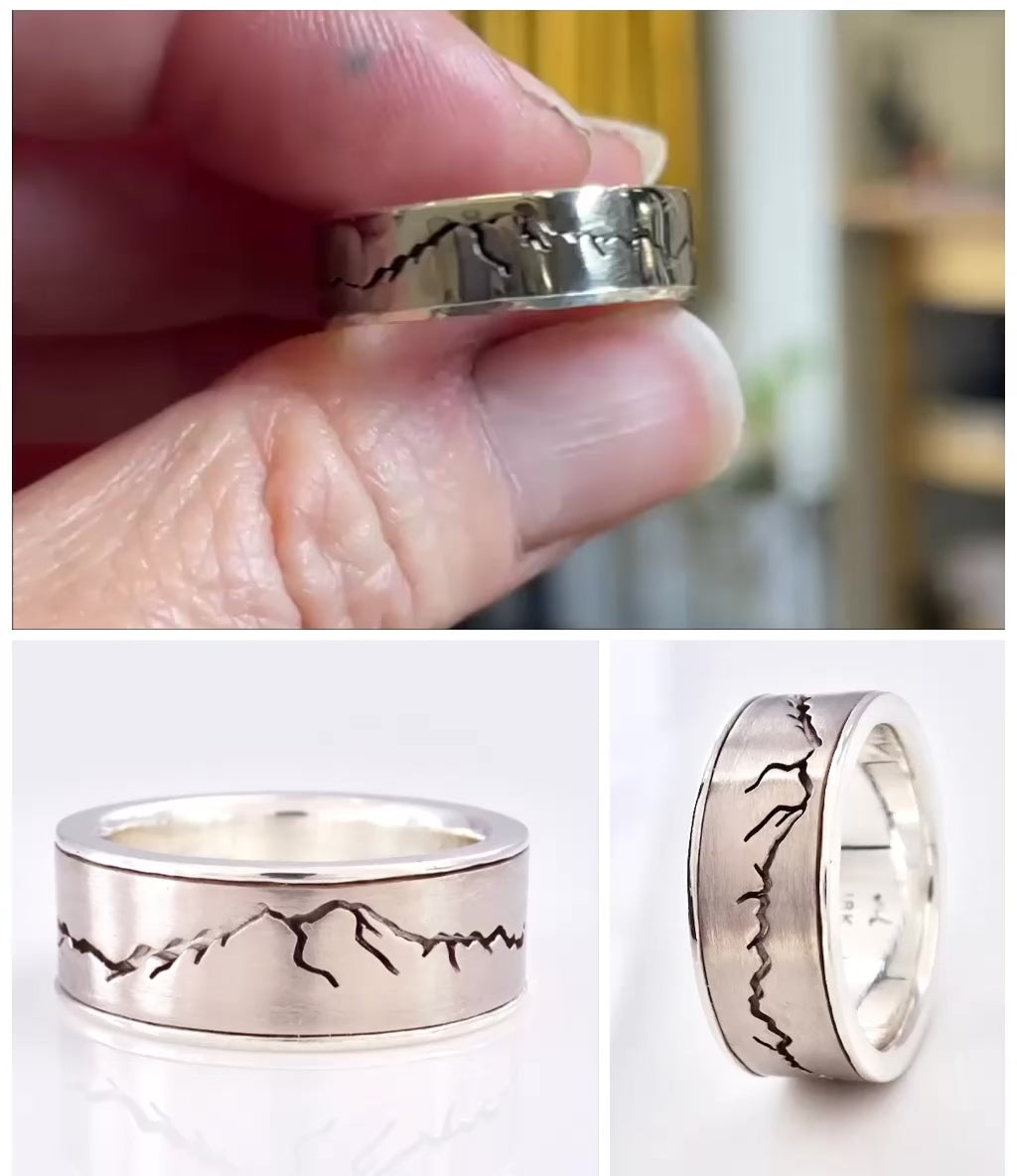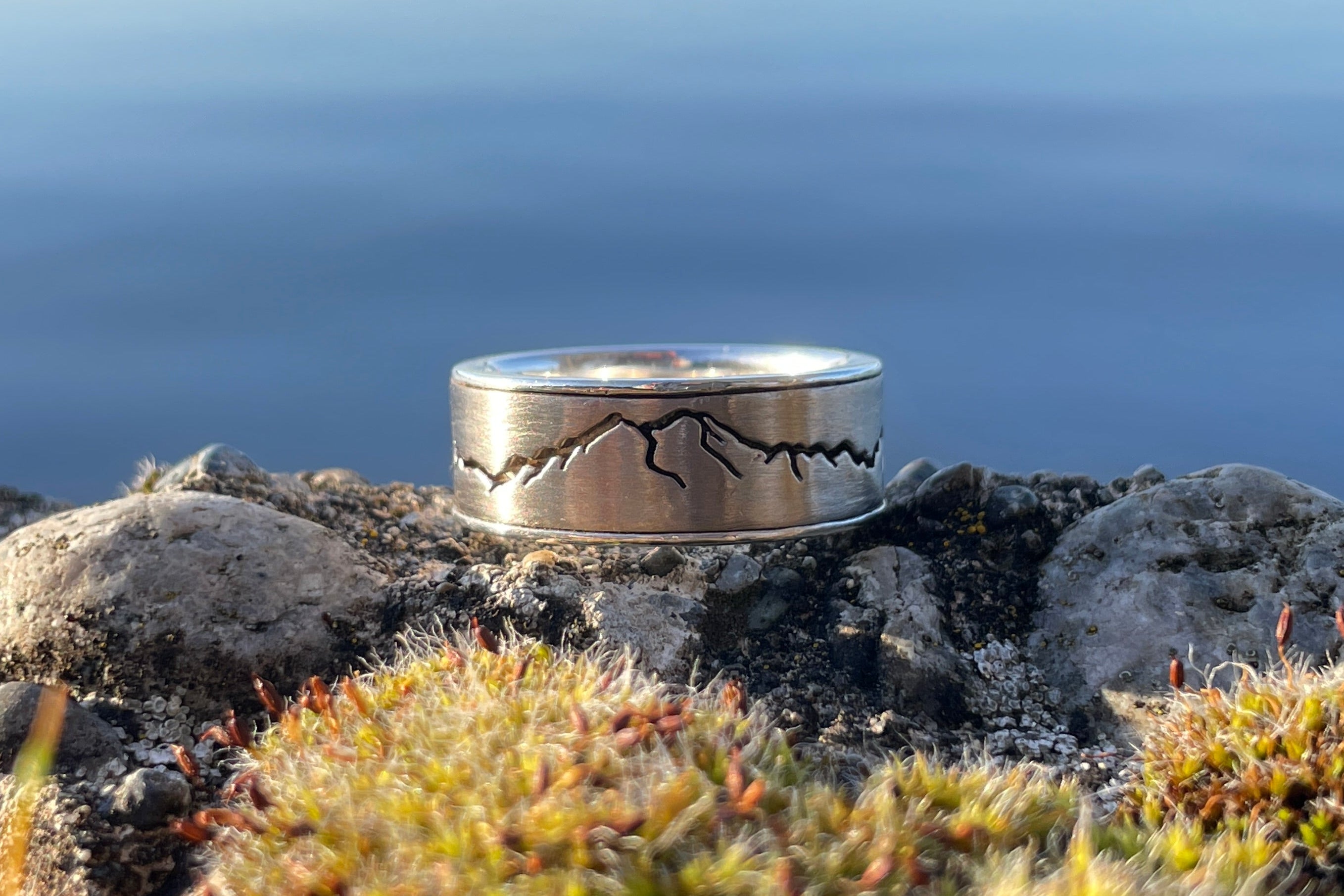 The Mixed Metals Mountain Wedding Band is handcrafted in recycled 18k palladium white gold with a sterling silver liner. Inspired by the majestic Olympic mountains in the Pacific Northwest this one of a kind ring was created for hikers, climbers, and outdoor lovers.