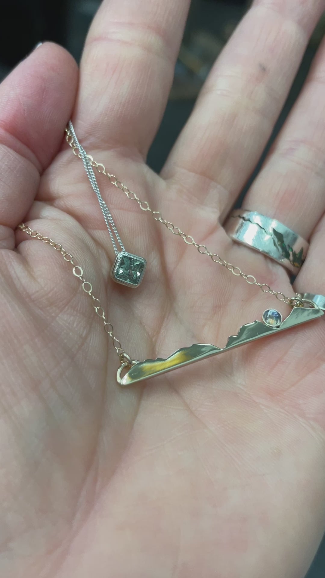 Montana Sapphire Princess Cut Necklace handmade with recycled 14k white gold and centered on an 16″ 10k white gold chain. Sapphire is set in an open back bezel setting and features Michelle’s signature details.