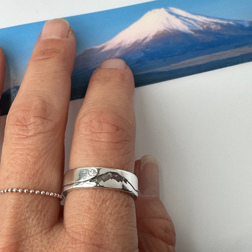 The Mount Fuji Summit Ring celebrates one of the iconic mountains in Japan. This handmade-to-order ring contains a gemstone of your choice inlayed within the summit of Mount Fuji. The gemstone is not backed within the summit so that light can pass through any translucent gemstone when the ring is not worn.