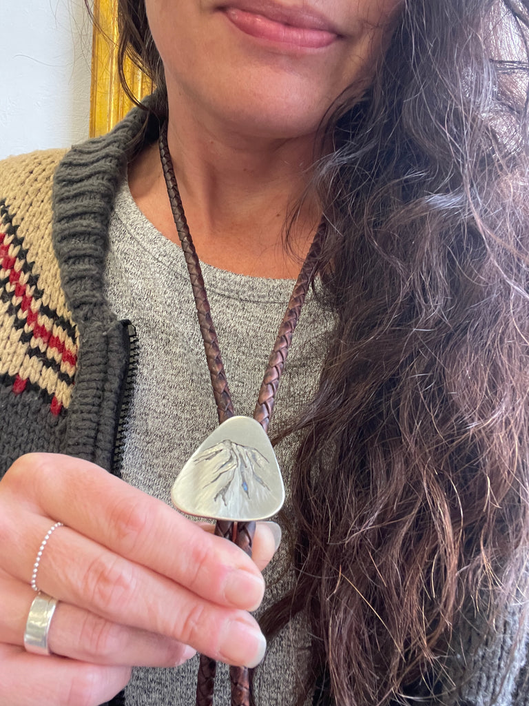 After you've placed your order, please send us a message with an image of the mountain you would like featured on your bolo. Within a few weeks we will reach out to you to begin finalizing the designs for your custom mountain bolo tie.