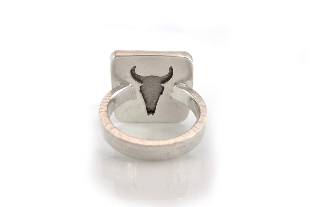 A bull has been pierced by hand on the silver sheet that supports the pyrite stone in celebration of Taurus the Bull. The 4mm wide sterling silver band contains a hammer texture.