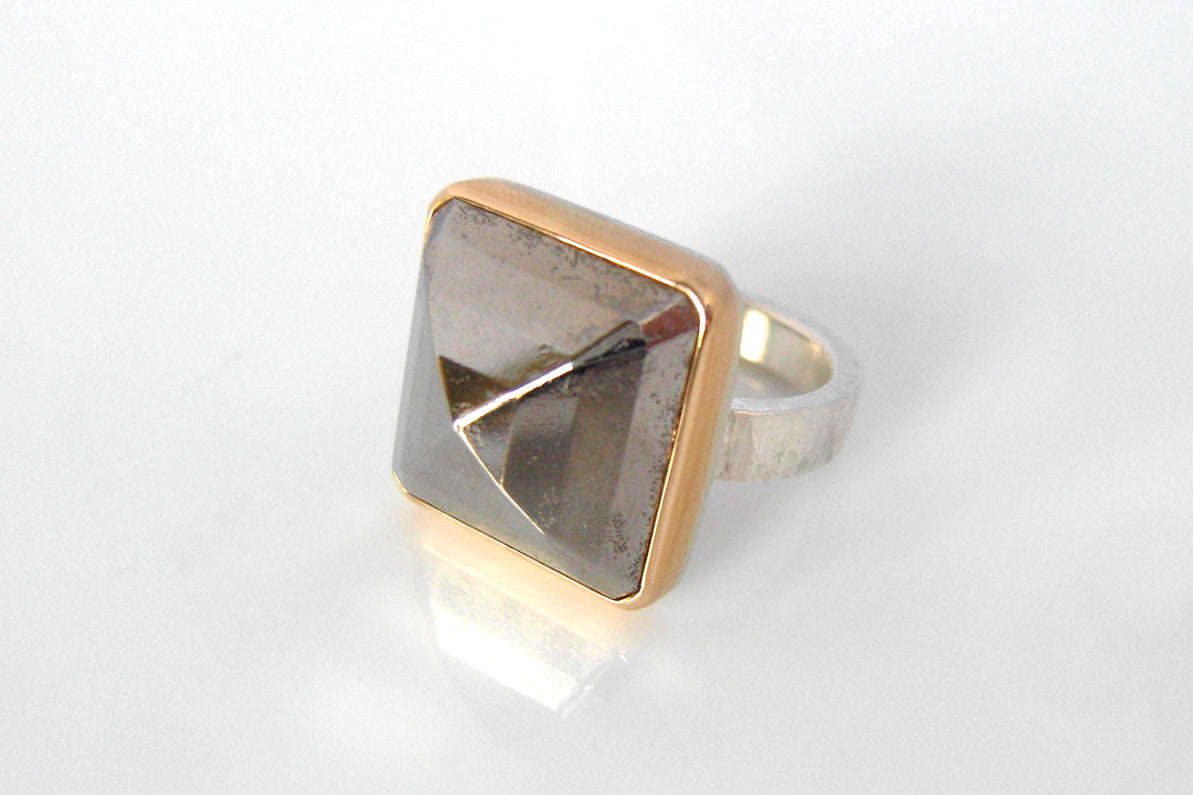 Rule your own pyramid with this chic Pyrite gemstone ring. The metallic pyrite surface reveals natural inclusions that give a beautiful antiqued look to this cool modern cocktail ring. The 1" Pyrite gemstone is handset in a recycled 14k yellow gold bezel and centered on a sterling silver band.
