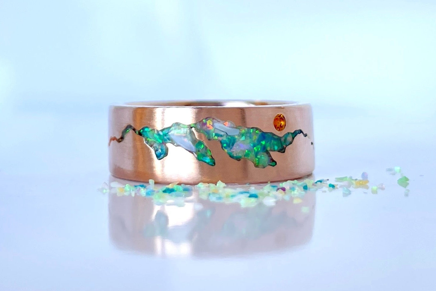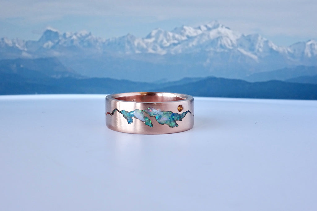 The mountains are calling with the Rose Gold Inlay Mountain Ring. Individually handcrafted from recycled 14k rose gold, this unique mountain ring features your favorite mountain range with the summit inlayed with your choice gemstone. Handmade to order exclusively by Michelle Lenae in Seattle WA.