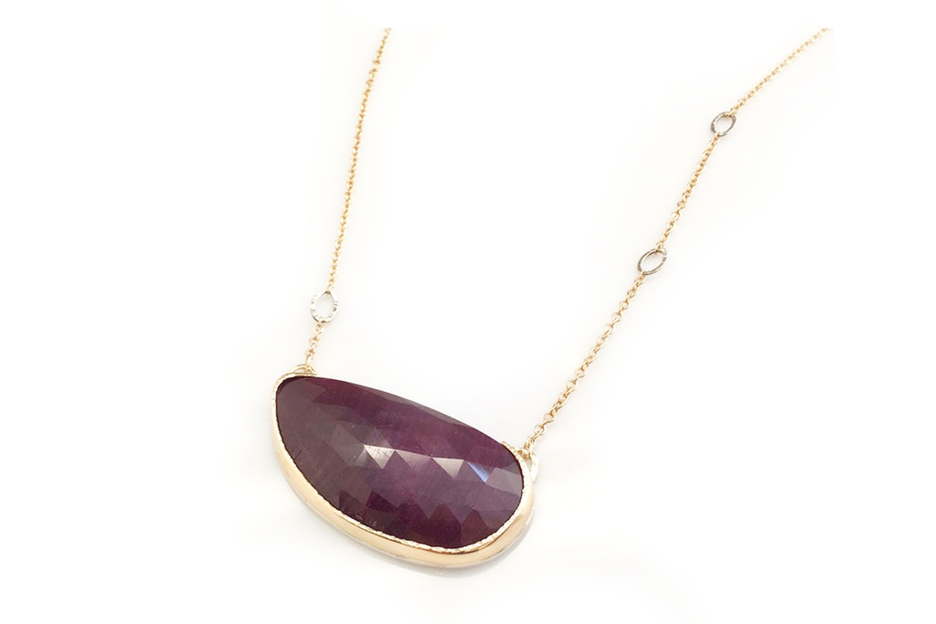 A gorgeous deep rose Ruby gemstone contains a finely polished and faceted face in this one of a kind pendant necklace. The genuine Ruby is set in a partial bezel of 14k yellow gold with a open-back crafted from sterling silver. The chain contains a mix of 14k yellow and white gold and made to a 16.5" length.