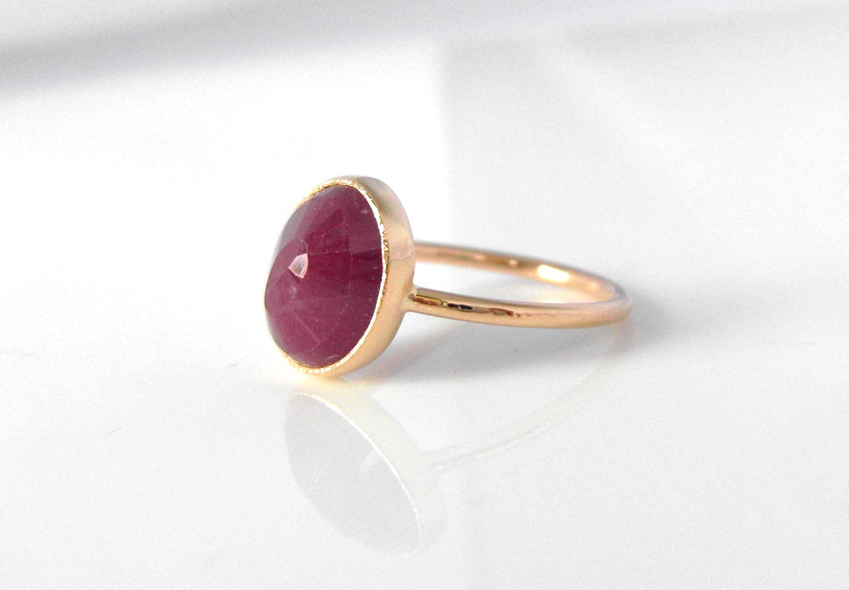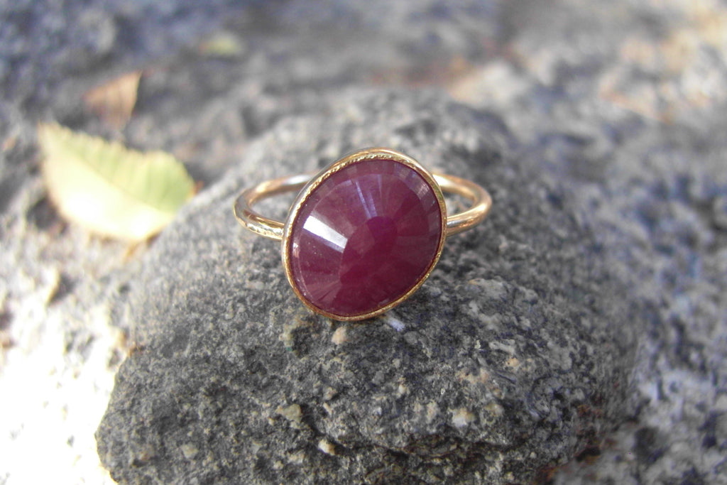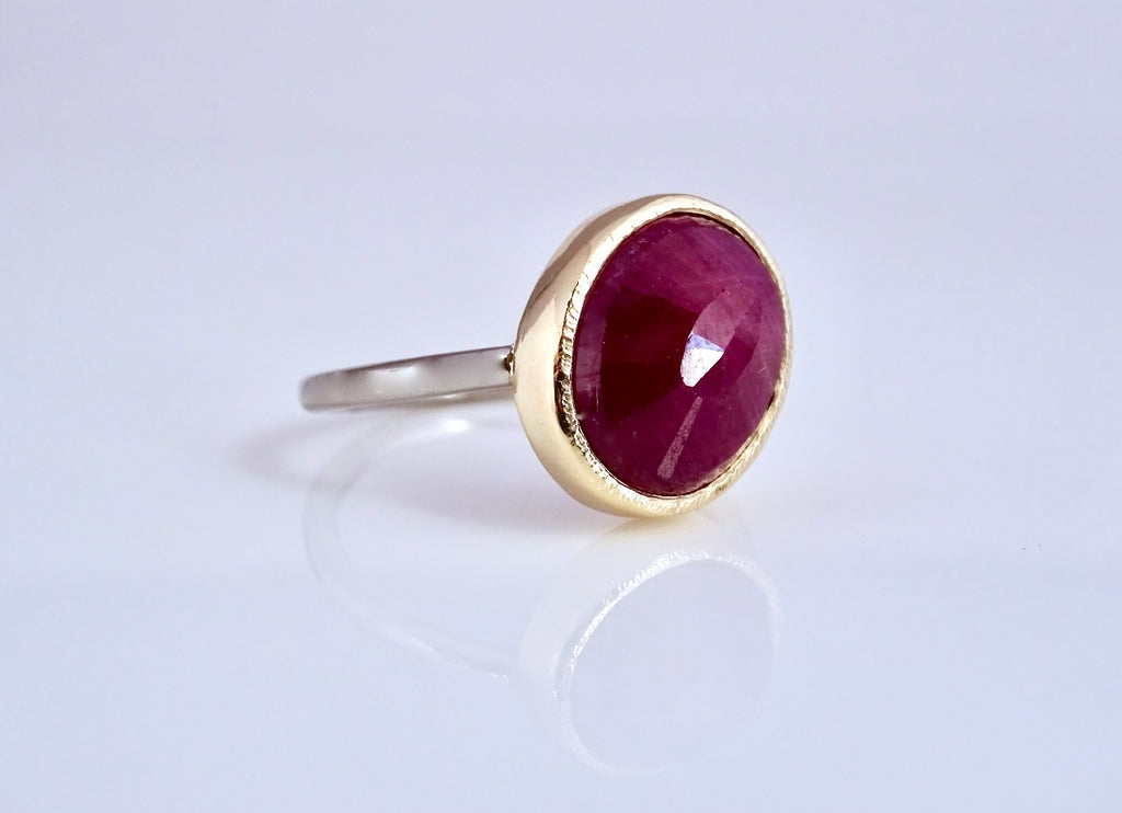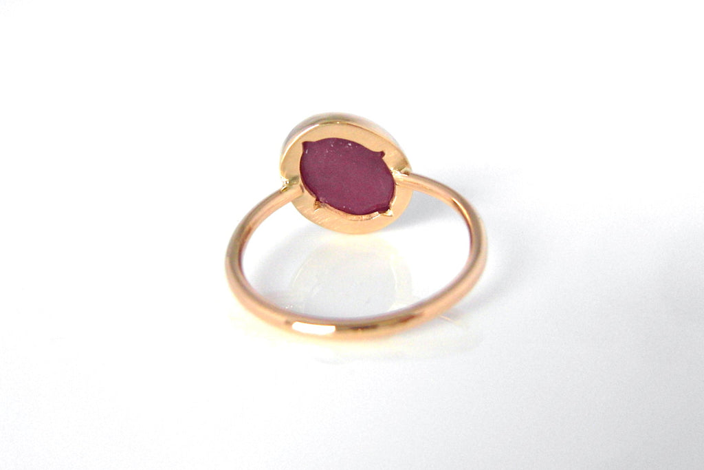 This beautiful Indian Ruby Oval Stacker Ring contains Michelle's signature Dahlia facet and is handset in your choice of 14k or 18k recycled gold. Handcrafted with precision, the bezel is open on the bottom and centered on a delicately hammered band.