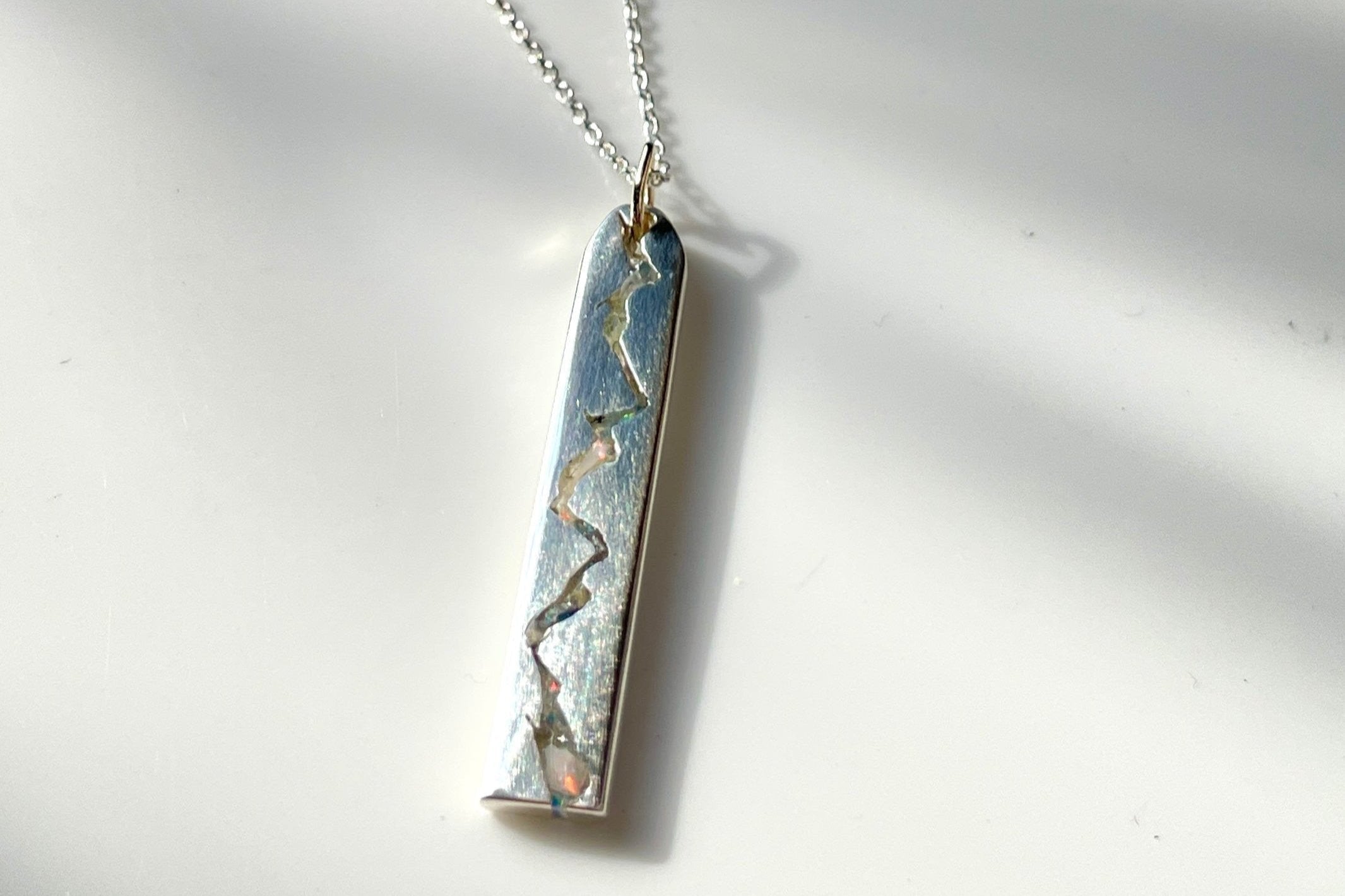 A sweet little Skinny Mountain Tag Necklace created as a one-of-kind. Mountain inspired, a fissure inlayed with turquoise, opal and other gemstones splits the recycled metal tag and connects by a single 14k yellow gold bale. 3 flush set diamonds accent one side of the silver tag like 3 satellites in the sky.