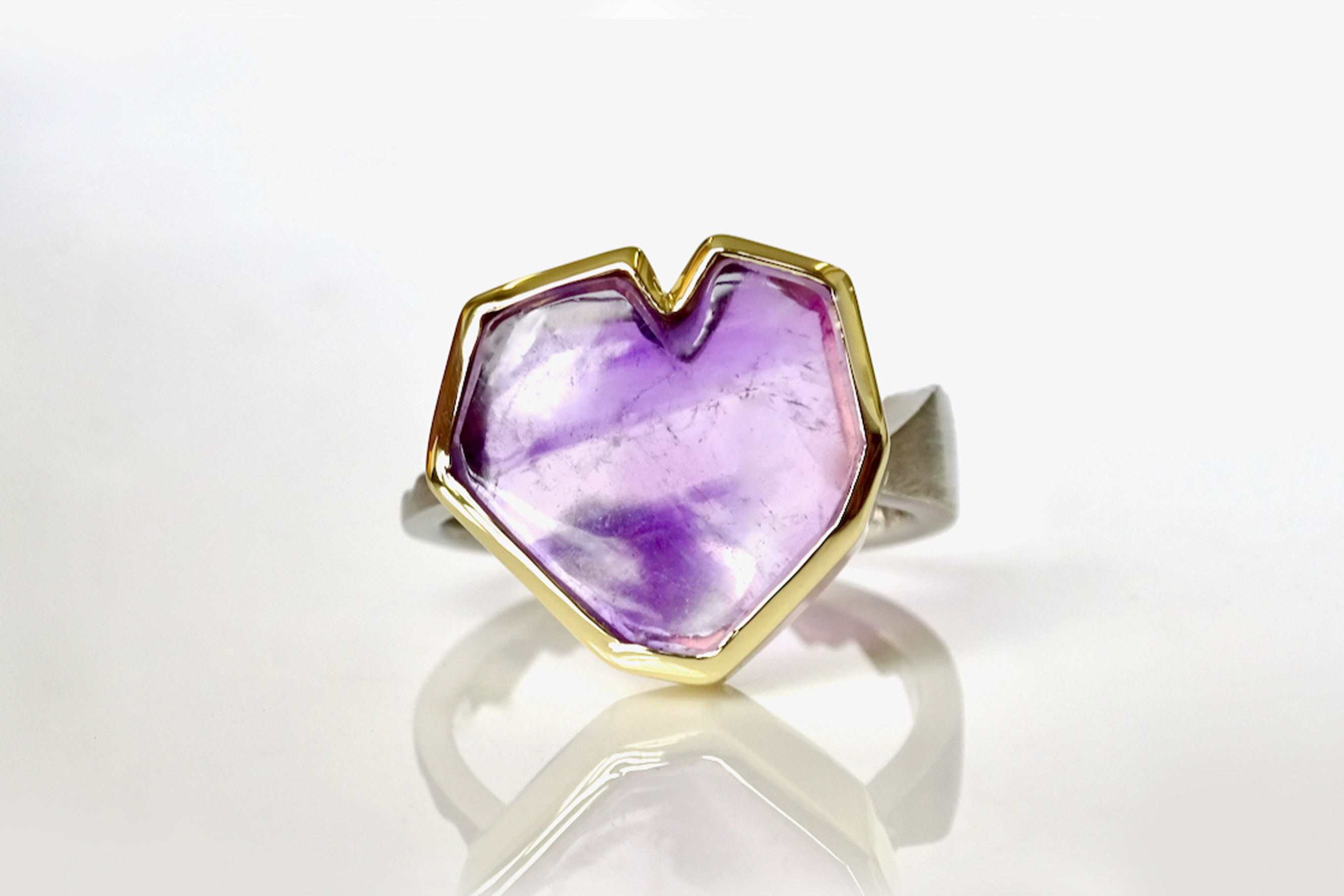 Michelle Lenae cuts by hand the gemstone of your choice into a wild heart shape, similar to what you see here. The wild heart gemstone is set in recycled gold and centered within a 3-5mm contoured band featuring the mountains of your choice.